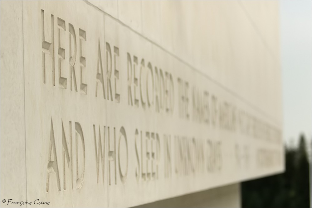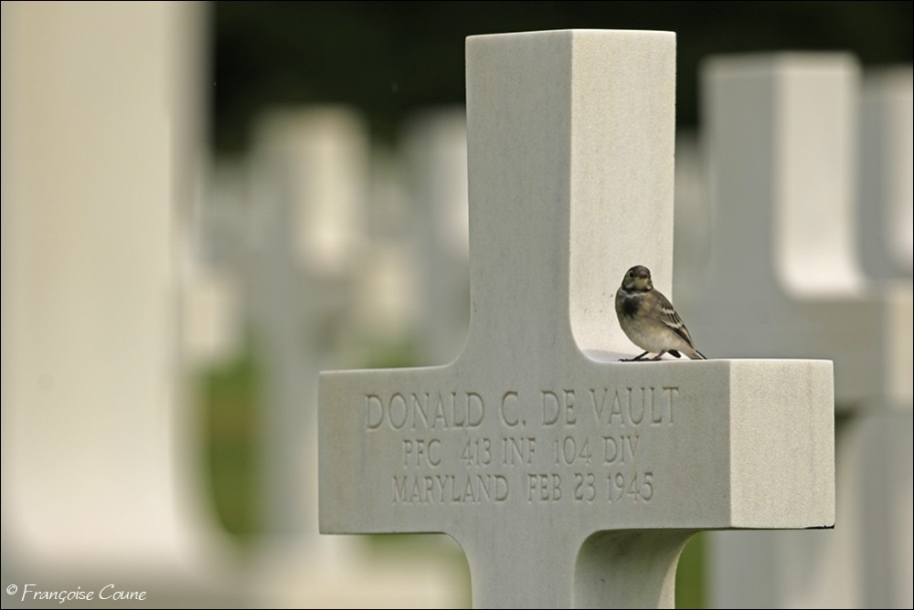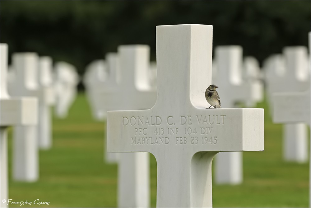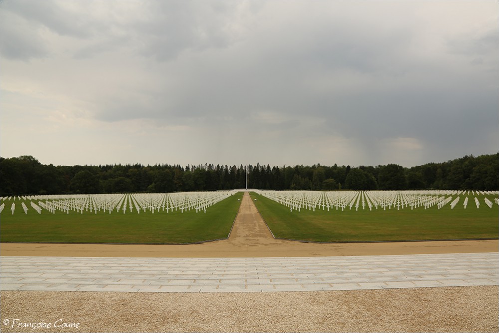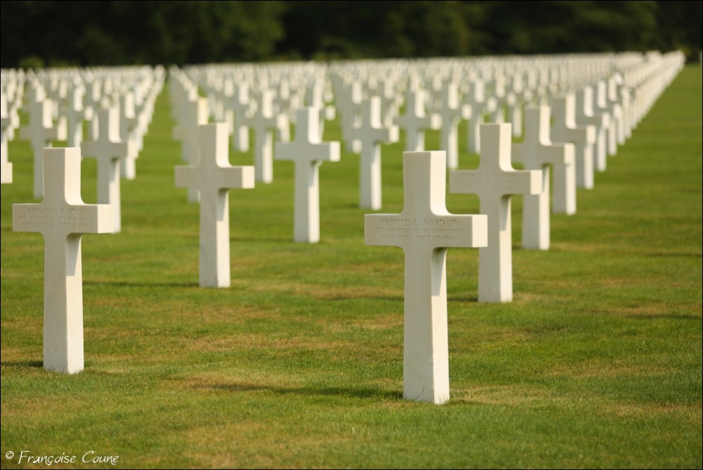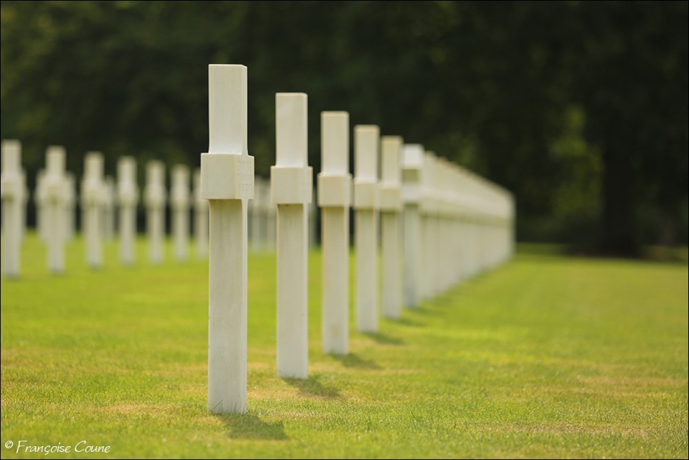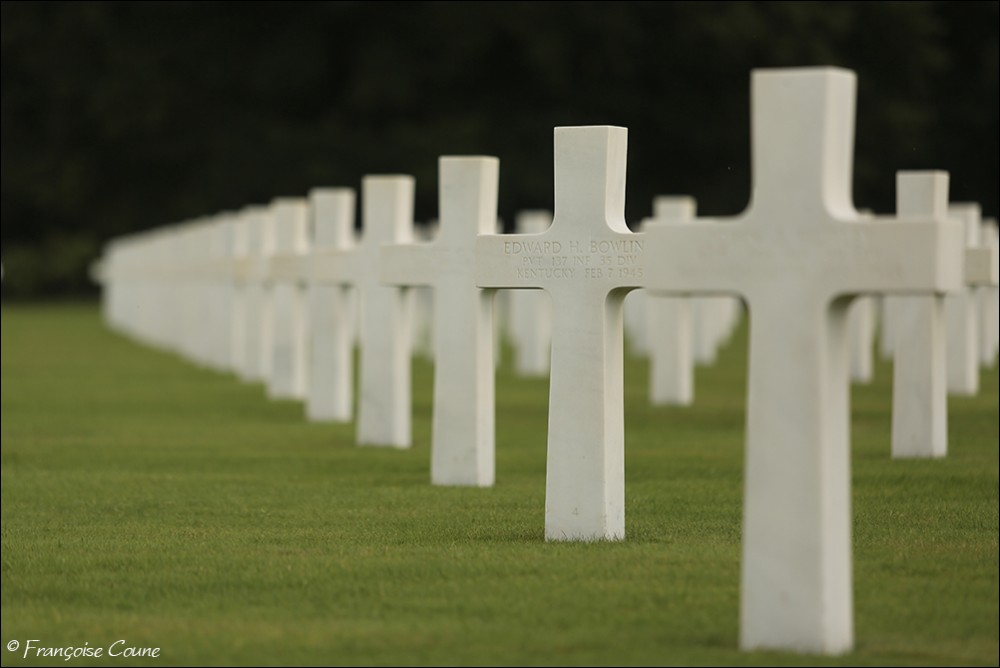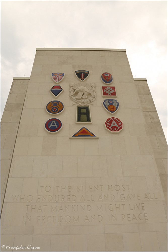 On 36.5 hectares, it houses the remains and burials of 5,328 soldiers, many of whom fell during the Battle of the Bulge. The cemetery has a rectangular shape. Its tomb squares form a Greek cross and are separated by two paths that intersect at its center. The Memorial, built of English limestone from Whitbed, is a large, austere parallelepiped. Its base rests on a plinth of blue Danube granite that can be reached by means of seven steps, the latter entirely encircling the building. An American eagle more than five meters high is carved in high relief on the south facade. He is surrounded by three female figures symbolizing Justice, Liberty and Truth and thirteen stars representing the United States. The names, units, and US state of origin of those buried appear on flagstones surrounding the Memorial. |