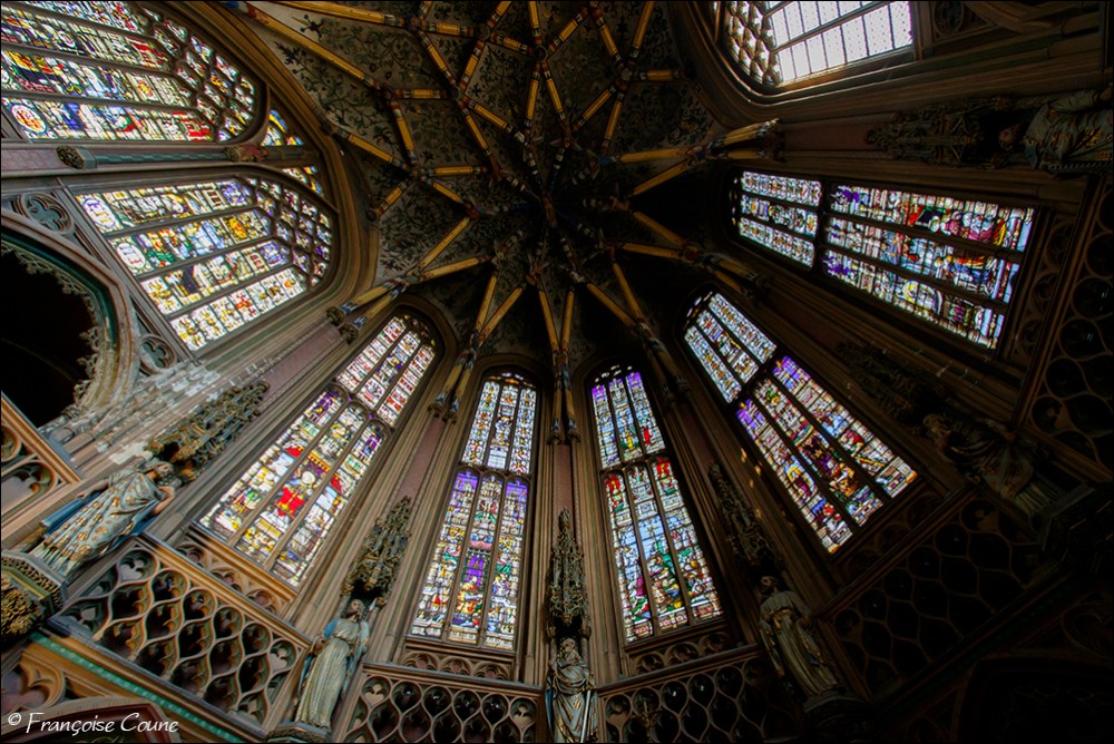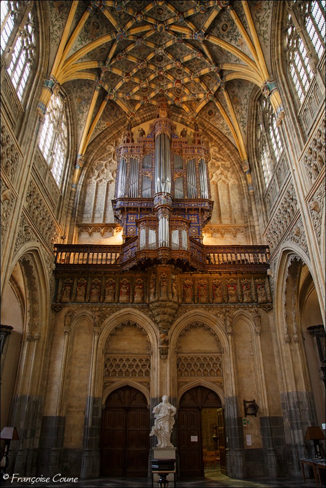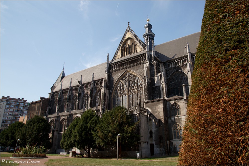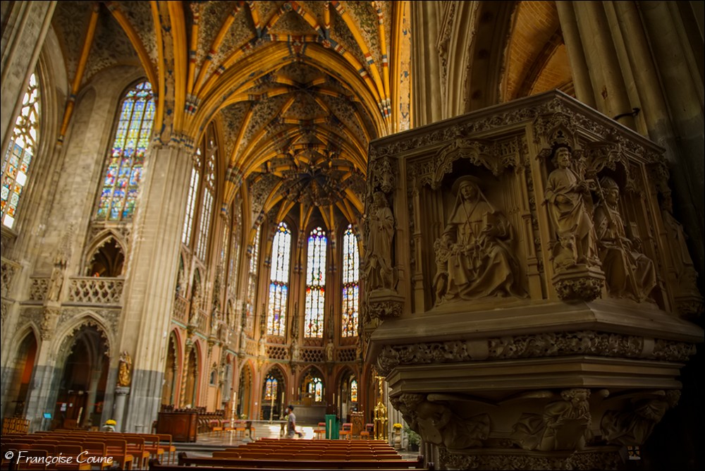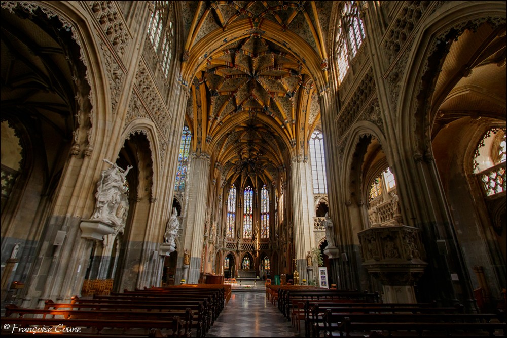 After the concordat of 1801, the collegiate church of Saint-Jacques became a parish church, the main cloister, a park and the demolished abbey buildings were replaced by modern buildings. The current Gothic church, whose construction was completed in 1538, replaced the original Romanesque church. The vault and its paintings are from the same period, as well as the stained glass windows in the choir dating from 1525 to 1531. The Renaissance portal added in 1558 is attributed to Lambert Lombard. The primitive church had a Romanesque front section and an octagonal bell tower dated around 11702. Only the front section with one of its three towers has been preserved. Among the most remarkable elements, the nave, real stone lace; the exceptional vault with more than 150 keystones in the central nave; the 14th century stalls; the Renaissance organ case and its Renaissance-style instrument rebuilt by the Schumacher organ factory in Eupen; the famous stained-glass window with the coats of arms of 32 old trades (16th century); the baroque statues of Del Cour and his school (late 17th century); and the Coronation of the Virgin (sculpted group from the 14th century). The stained-glass windows of Saint-Jacques are considered by some authors to be perhaps the most beautiful in Belgium. The French archaeologist Adolphe Napoléon Didron does not even hesitate to rank them at the top of all those that survive from the 16th century. |