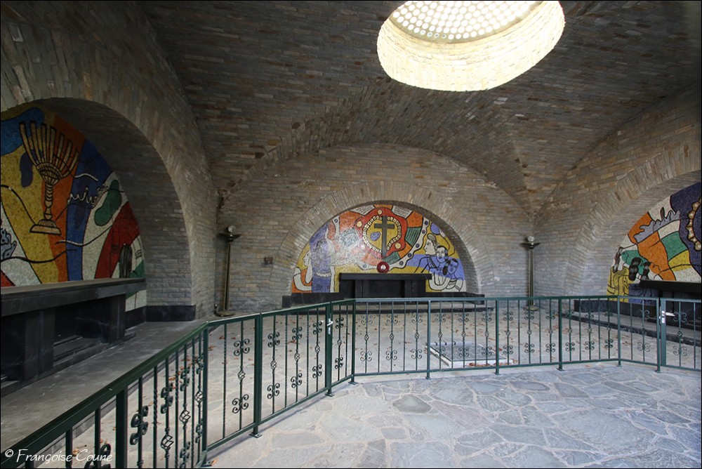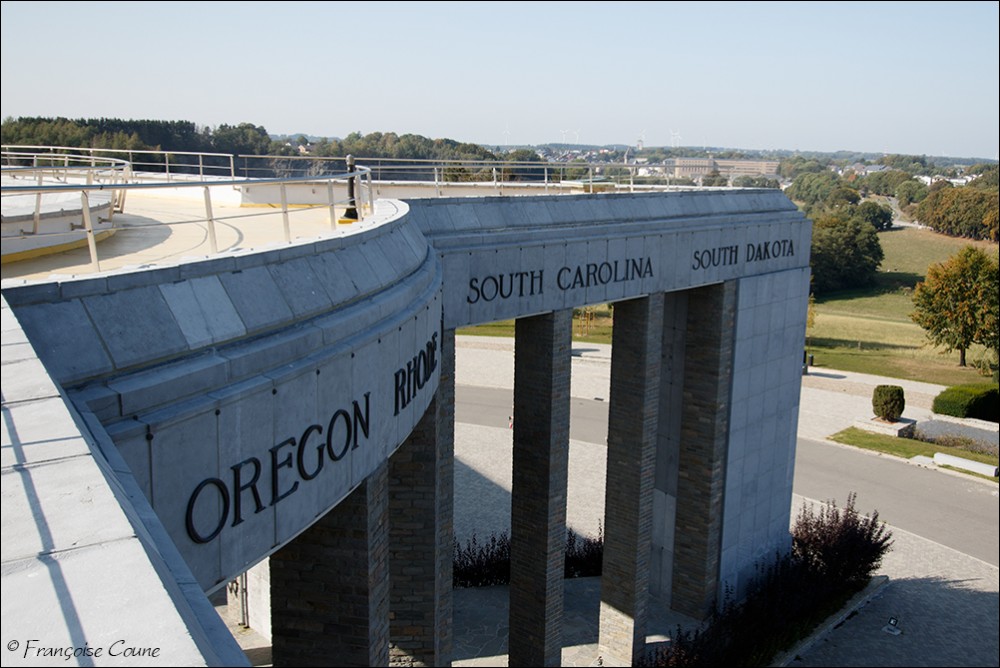 Built, according to the plans of the architect Georges Dedoyard1,2, in the shape of a star, a distinctive sign of the Allied troops during the liberation campaign (evocation of the American flag), on a natural elevation along the Wiltz river, the monument bears the Latin inscription "populus belgicus memor liberatoribus americanis". On the pediment of the monument, outside and inside, are inscribed the names of all the member states of the United States of America, including those (Alaska, Hawaii) which joined the union after the war. . Near the monument is a crypt housing altars in three vaulted niches each decorated with a mosaic by the French artist Fernand Léger. Each altar is dedicated to a cult: Catholic, Protestant and Jewish. |
