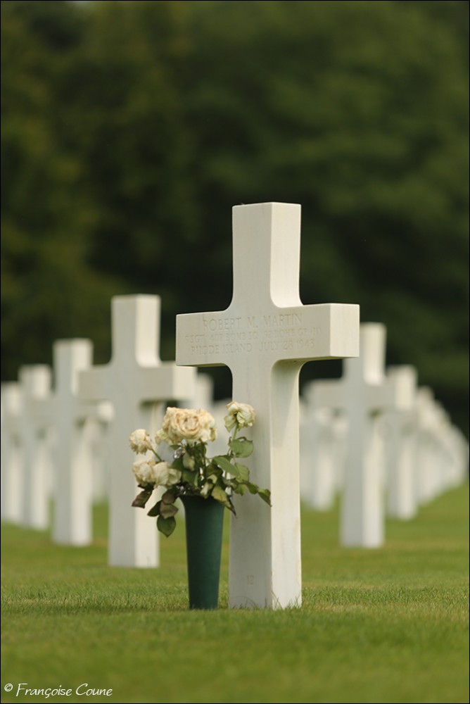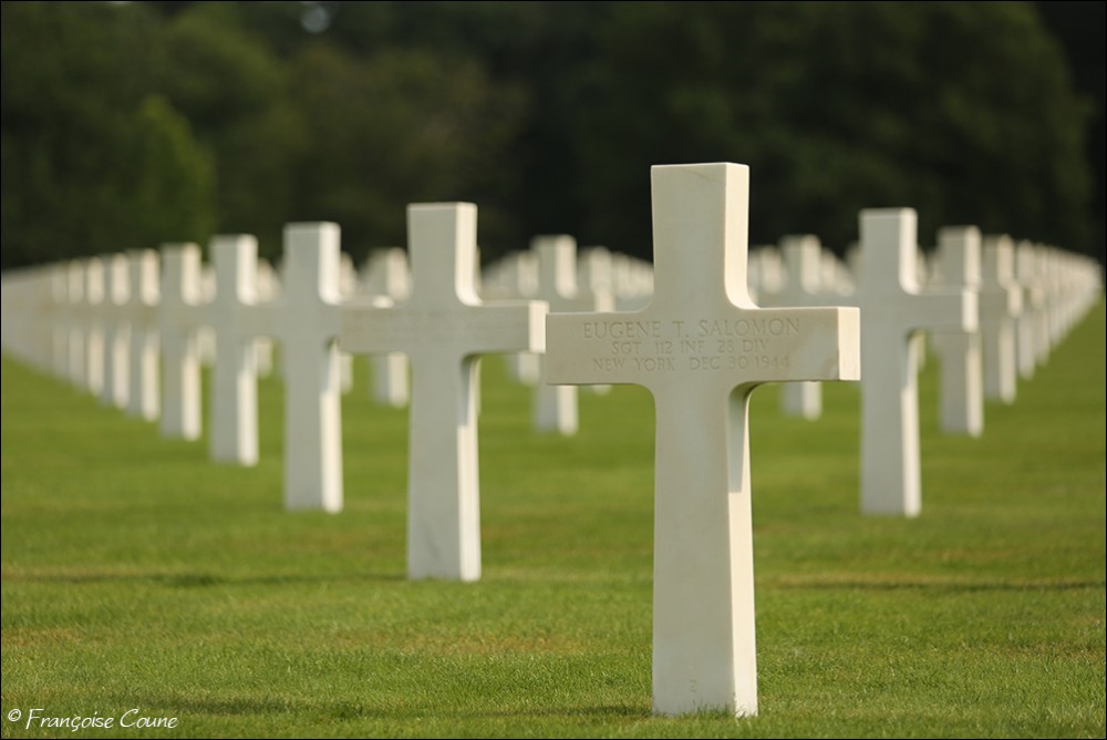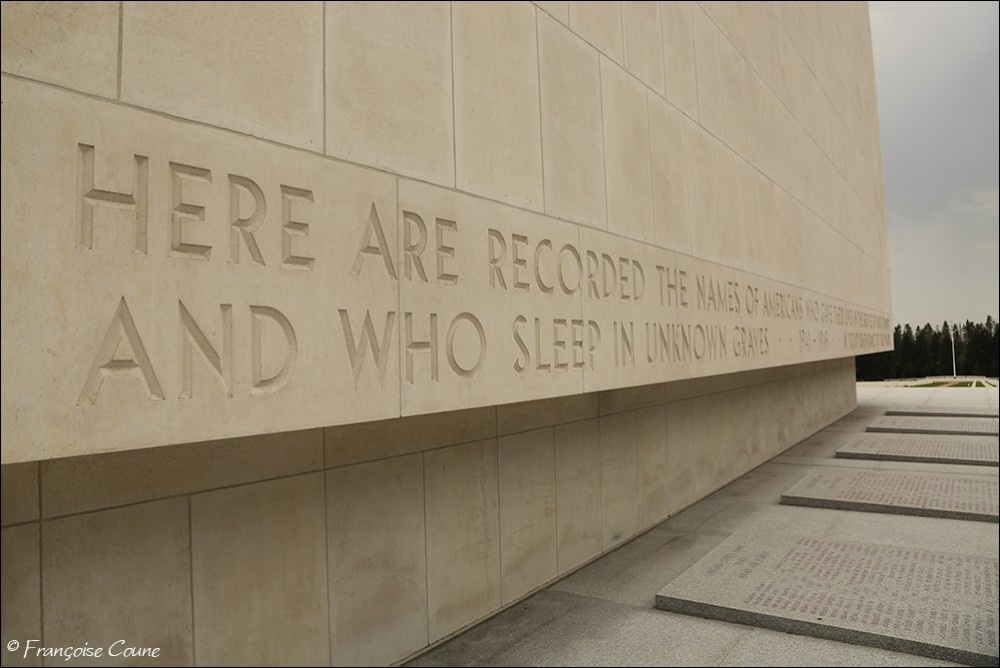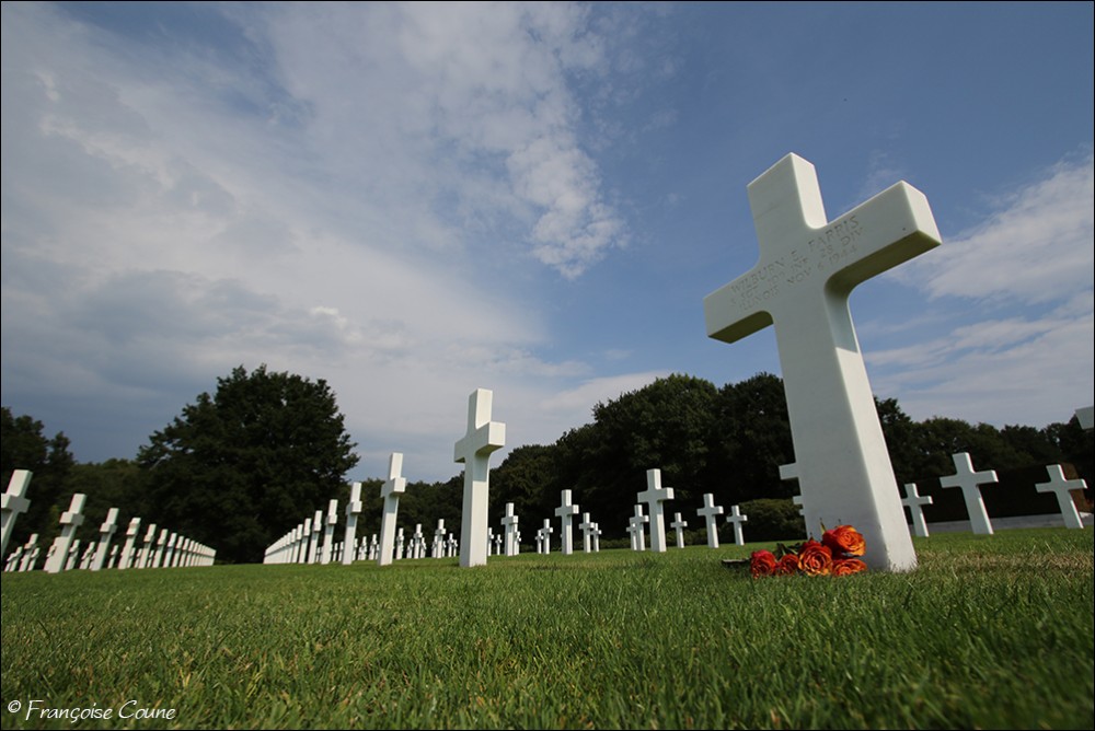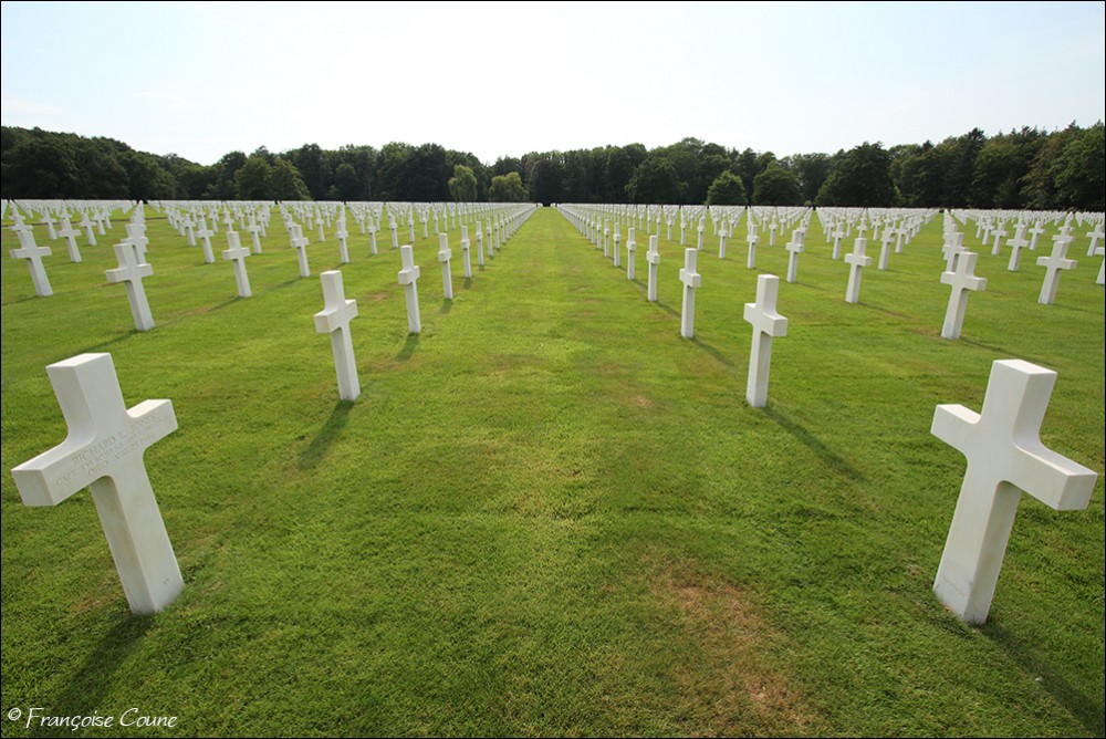 On 36.5 hectares, it houses the remains and burials of 5,328 soldiers, many of whom fell during the Battle of the Bulge. The cemetery has a rectangular shape. Its tomb squares form a Greek cross and are separated by two paths that intersect at its center. The Memorial, built of English limestone from Whitbed, is a large, austere parallelepiped. Its base rests on a plinth of blue Danube granite that can be reached by means of seven steps, the latter entirely encircling the building. An American eagle more than five meters high is carved in high relief on the south facade. He is surrounded by three female figures symbolizing Justice, Liberty and Truth and thirteen stars representing the United States. The names, units, and US state of origin of those buried appear on flagstones surrounding the Memorial. |