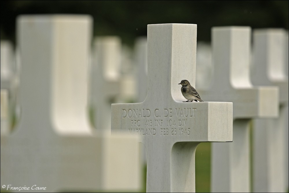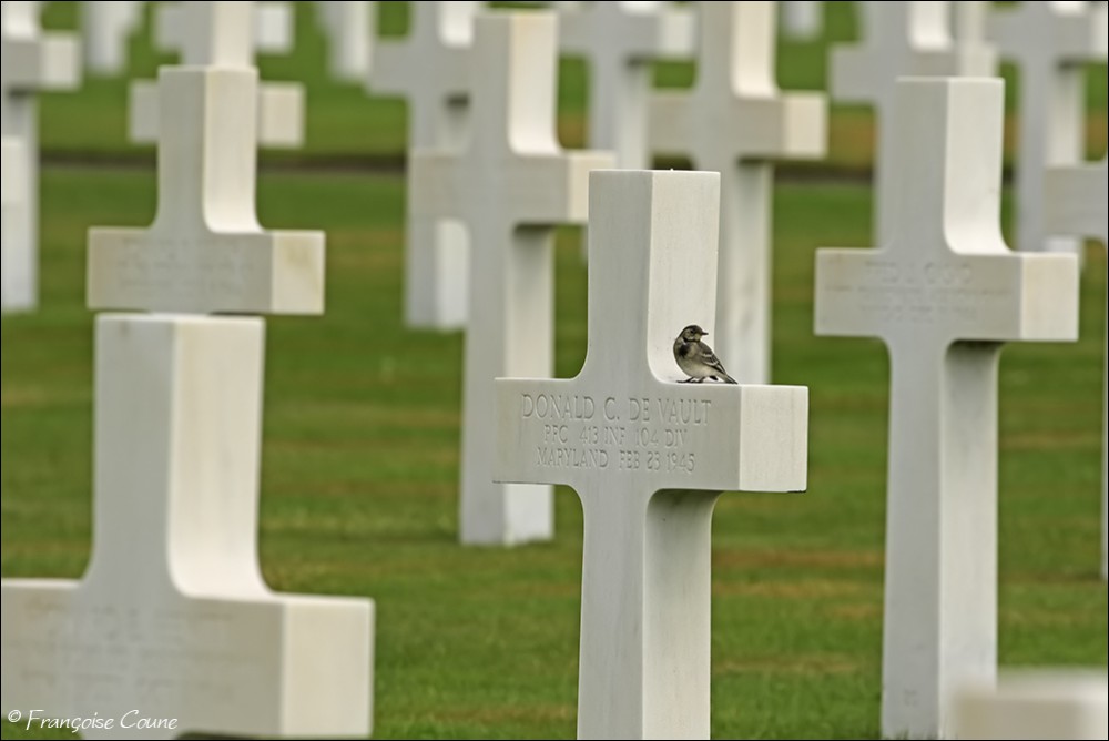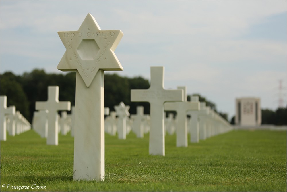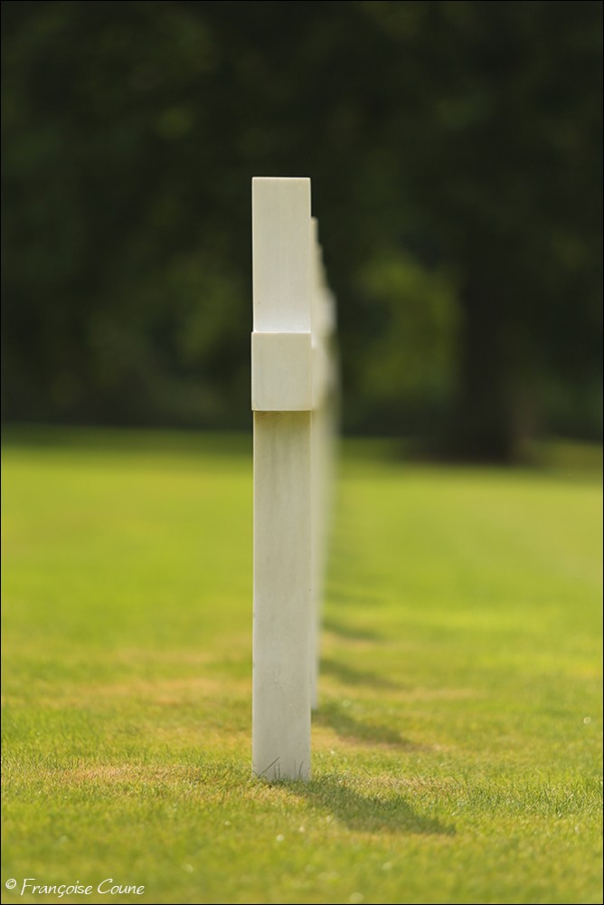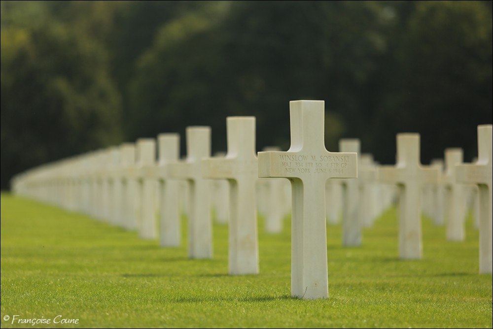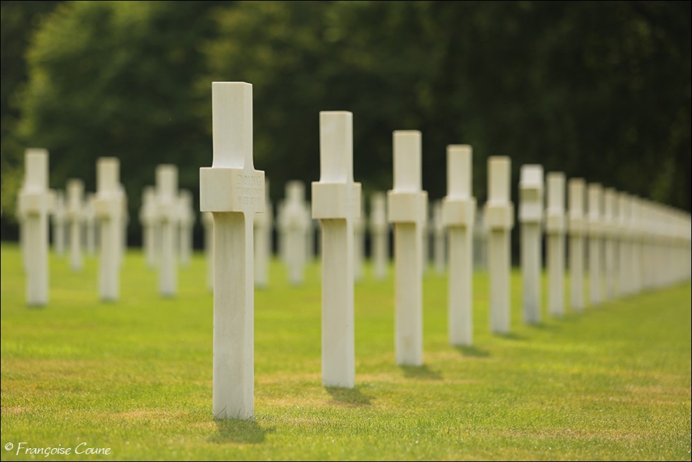 On 36.5 hectares, it houses the remains and burials of 5,328 soldiers, many of whom fell during the Battle of the Bulge. The cemetery has a rectangular shape. Its tomb squares form a Greek cross and are separated by two paths that intersect at its center. The Memorial, built of English limestone from Whitbed, is a large, austere parallelepiped. Its base rests on a plinth of blue Danube granite that can be reached by means of seven steps, the latter entirely encircling the building. An American eagle more than five meters high is carved in high relief on the south facade. He is surrounded by three female figures symbolizing Justice, Liberty and Truth and thirteen stars representing the United States. The names, units, and US state of origin of those buried appear on flagstones surrounding the Memorial. |