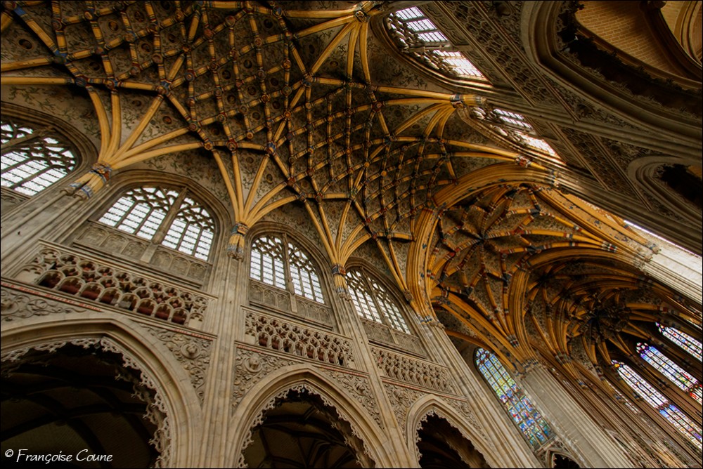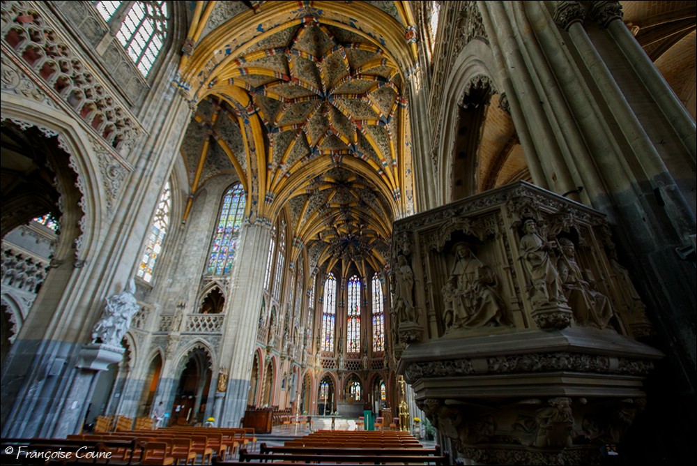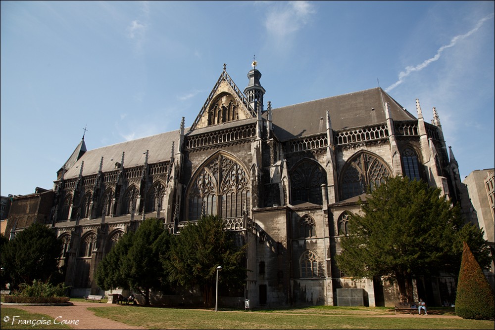 After the concordat of 1801, the collegiate church of Saint-Jacques became a parish church, the main cloister, a park and the demolished abbey buildings were replaced by modern buildings. The current Gothic church, whose construction was completed in 1538, replaced the original Romanesque church. The vault and its paintings are from the same period, as well as the stained glass windows in the choir dating from 1525 to 1531. The Renaissance portal added in 1558 is attributed to Lambert Lombard. The primitive church had a Romanesque front section and an octagonal bell tower dated around 11702. Only the front section with one of its three towers has been preserved. Among the most remarkable elements, the nave, real stone lace; the exceptional vault with more than 150 keystones in the central nave; the 14th century stalls; the Renaissance organ case and its Renaissance-style instrument rebuilt by the Schumacher organ factory in Eupen; the famous stained-glass window with the coats of arms of 32 old trades (16th century); the baroque statues of Del Cour and his school (late 17th century); and the Coronation of the Virgin (sculpted group from the 14th century). The stained-glass windows of Saint-Jacques are considered by some authors to be perhaps the most beautiful in Belgium. The French archaeologist Adolphe Napoléon Didron does not even hesitate to rank them at the top of all those that survive from the 16th century. |