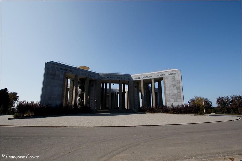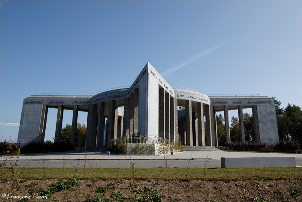 Built, according to the plans of the architect Georges Dedoyard1,2, in the shape of a star, a distinctive sign of the Allied troops during the liberation campaign (evocation of the American flag), on a natural elevation along the Wiltz river, the monument bears the Latin inscription "populus belgicus memor liberatoribus americanis". On the pediment of the monument, outside and inside, are inscribed the names of all the member states of the United States of America, including those (Alaska, Hawaii) which joined the union after the war. . Near the monument is a crypt housing altars in three vaulted niches each decorated with a mosaic by the French artist Fernand Léger. Each altar is dedicated to a cult: Catholic, Protestant and Jewish. |